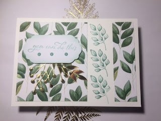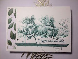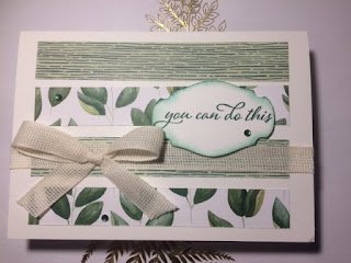 And this one, super easy, I stamped the leaf multiple times (without re-inking) to give the fading effect, a strip of DSP, a bit of ribbon to add texture, sentiment and bling.