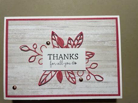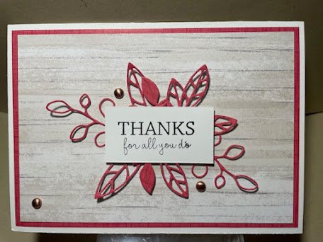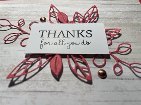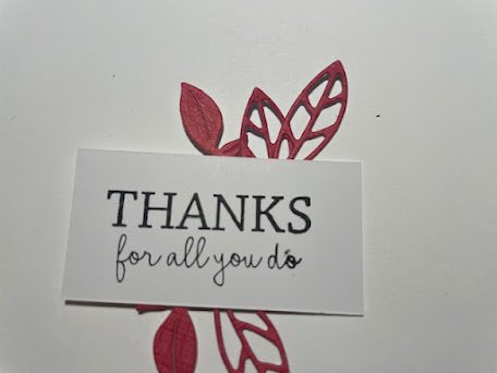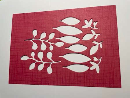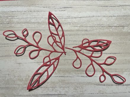To keep some continuity in the card, I thought I would use the Timeless Charm Dies to cut some cute little leaves from the red sheet to use as a feature on the front of the card.