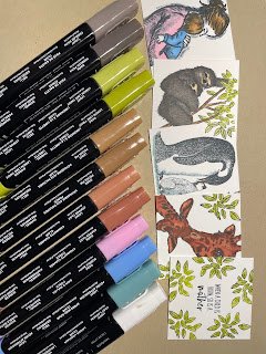 Firstly I took all the 6 x 6 cm squares and stamped them in Momento Ink using images from Places in the Heart stamp set and Sweet and Precious stamp set.