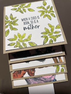 I placed the bottom card first (with the mum and bub) then the next one (giraffes) on top of that and continued until they were all attached. Trim and decorate the tab as you like.